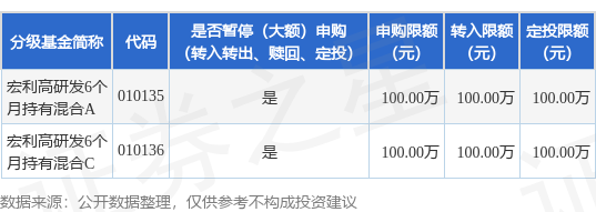 本站消息,1月7日宏利基金管理有限公司发布《宏利高研发创新6个月持有期混合型证券投资基金暂停大额申购、大额转换转入、定期定额投资业务的公告》。公告中提示,为充分保护基金份额持有人利益,保障基金平稳运作,自2026年1月8日起宏利高研发创新6个月持有期混合型证券投资基金暂停大额申购、大额转换转入、定期定额投资业务,申购、转换转入上限金额为100.0万元,下属分级基金调整明细如下: